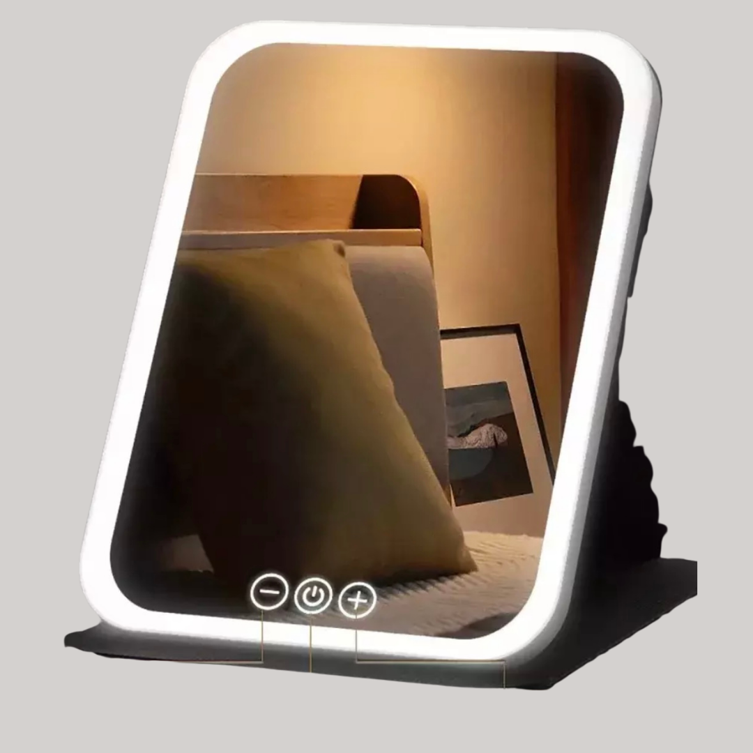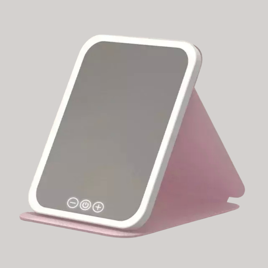 Equipado com luzes LED e botão sensível ao toque, o espelho permite ajustar a intensidade da iluminação conforme a necessidade ideal para maquiagem, skincare ou ajustes rápidos.
